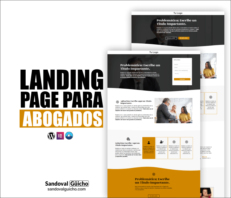 Landing Page: Fantástica Landing Page diseñada al 100% para el sector de abogados y jurídicos. Puedes utilizar este diseño para atraer prospectos potenciales en contratar tus servicios como profesional. Aquí, algunos ejemplos: Solicitar cotizaciones, descarga de un e-book, acceder a un masterclass, etc.